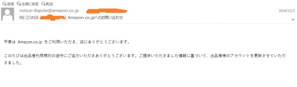 メール題名にCASEとありますが、この返信はセラーセントラルの履歴に残ってません。テクサポでしたら履歴が残ります。つまりアカスペからのものということです。